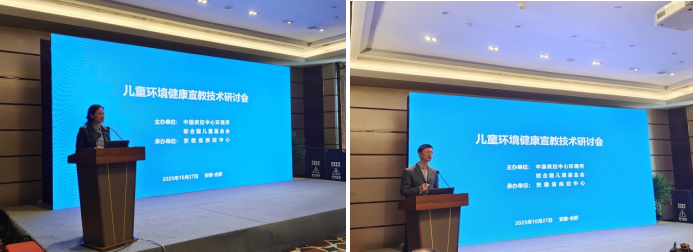 2025年10月27日,由中国疾病预防控制中心环境与健康相关产品安全所(以下简称“中国疾控中心环境所”)与联合国儿童基金会联合主办,安徽省疾病预防控制中心承办的儿童环境健康宣教技术研讨会在安徽省合肥市顺利召开。中国疾控中心环境所所长王林研究员、联合国儿童基金会环境健康项目官员孙辉博士、安徽省疾控局李军调研员、安徽省疾控中心副主任徐庆华主任医师等出席会议,联合国儿童基金会驻华办事处社会行为引导专家Hayon Nam(南贺然)女士应邀做了专题讲座。