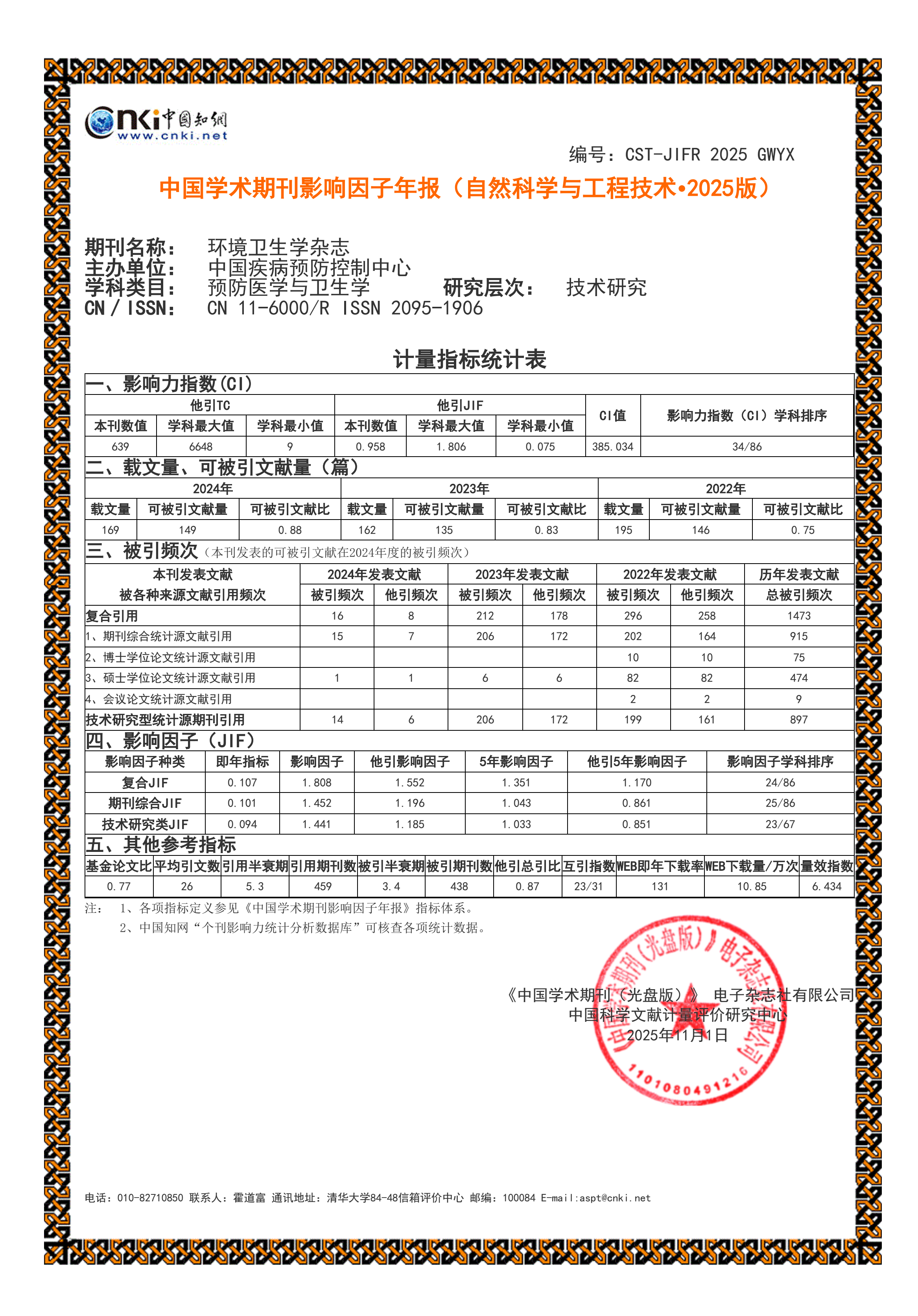 《环境卫生学杂志》2025年影响因子新提升