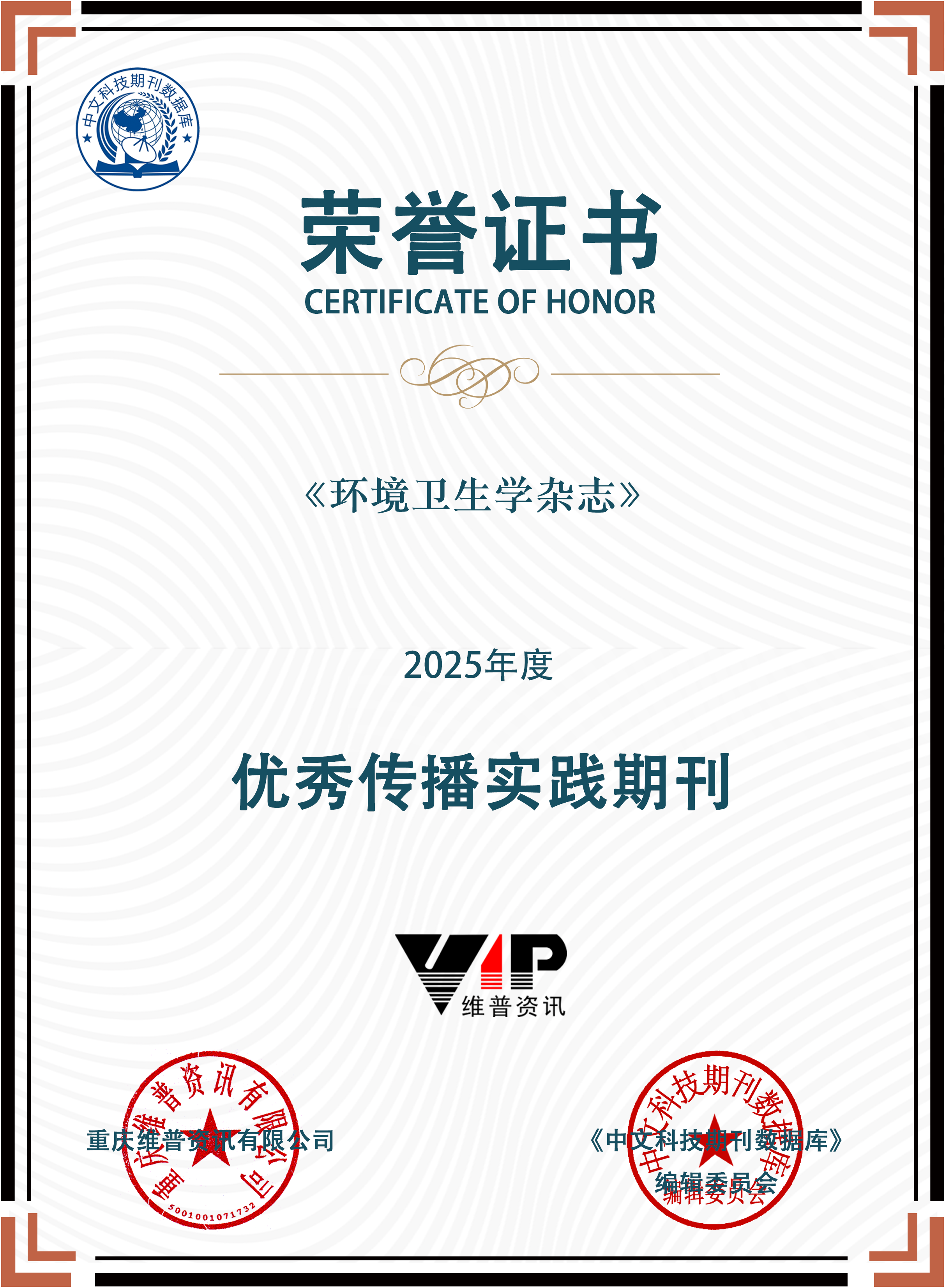 《环境卫生学杂志》被重庆维普资讯有限公司与《中文科技期刊数据库》编辑委员会联合评为2025年度“优秀传播实践期刊”。维普“优秀传播实践期刊”是基于维普《中文科技期刊数据库》,对年度所收录期刊在促进学术资源共享传播实践成果的认可。