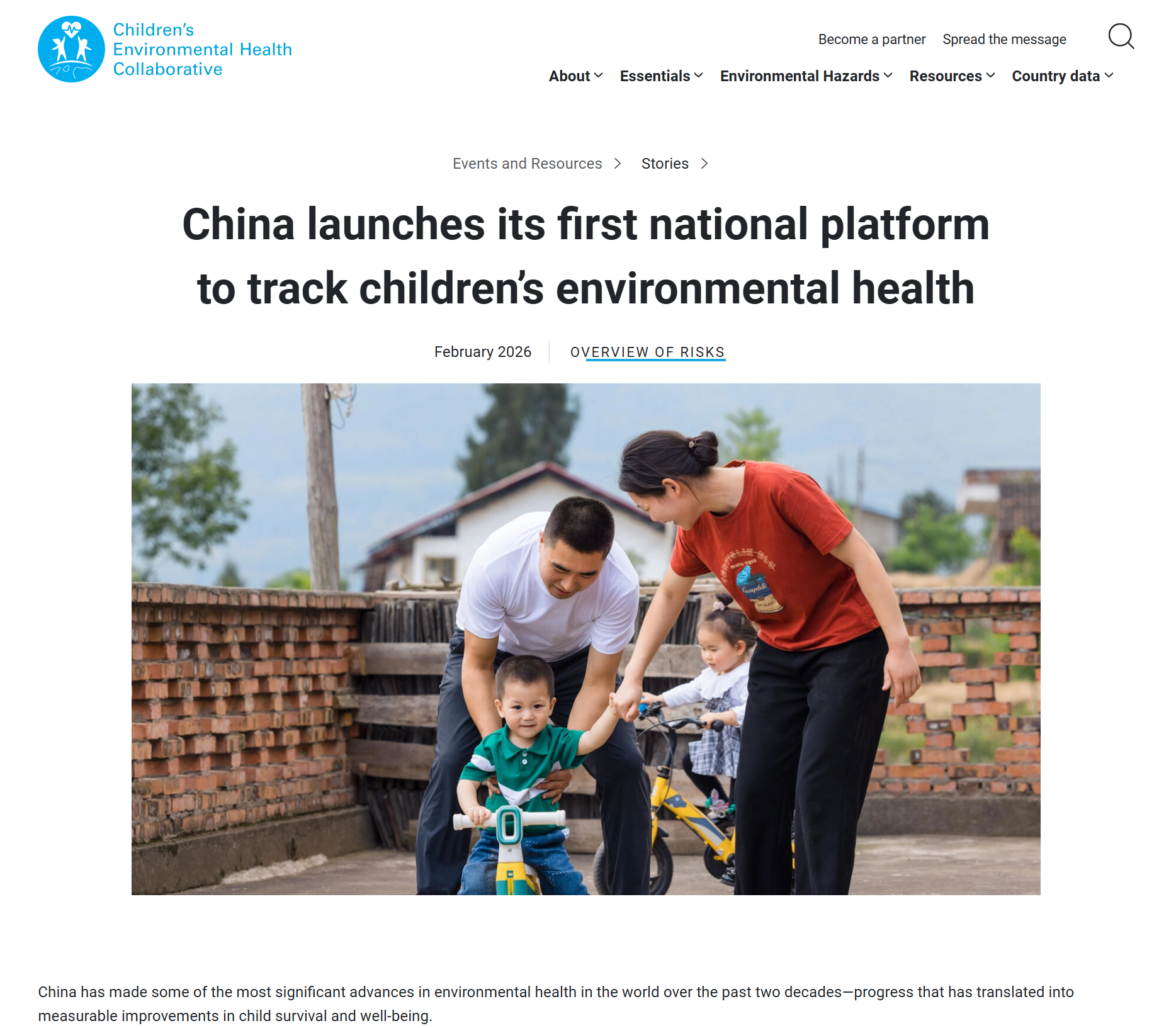2026年2月26日联合国儿童基金会以“China launches its first national platform to track children’s environmental health”(中国推出首个国家级儿童环境健康监测平台)为题,在其官方网站的全球儿童环境健康合作机制专栏中推荐了中国疾病预防控制中心环境所的“环境与儿童健康专栏”(https://cehi.niehs.cn/home-cn/),高度评价了中国在儿童环境健康领域的重大成就,联合国儿童基金会认为这个儿童环境健康专栏并不仅仅是一个数据存储库,而是一个可供实践操作的行动工具,该专栏为政府部门如何将科研证据转化为政策性行动提供了生动范例。全文翻译如下:
